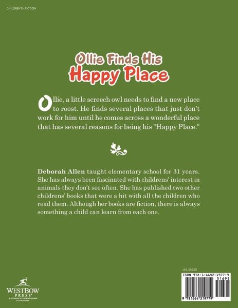 Ollie, a little screech owl needs to find a new place to roost. He finds several places that just don't work for him until he comes across a wonderful place that has several reasons for being his "Happy Place."
