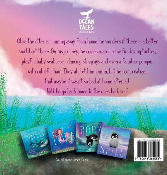 A curious otter's tale from popular Ocean Tales Children's Books series Ollie is a heart-warming picture book written in lyrical rhyme that will be cherished by children, ocean lovers, teachers and parents. Ollie the otter is running away from home, he wonders if there is a better world out there. On his journey, he comes across some fun-loving turtles, playful baby seahorses, dancing stingrays and even a familiar penguin with colorful hair. They all let him join in, but he soon realizes that maybe it wasn't so bad at home after all. Will he go back home to the ones he loves? He swam with the turtles until they had lunch. They munched on some algae with shrimp for a crunch. He stirred it around. It was slimy and thick, but with his first mouthful, their soup made him sick! It was then that he thought of his mum's urchin stew. He missed her, but just for a second or two. "I can't go home yet," Ollie said with despair. "I want to discover what else is out there."