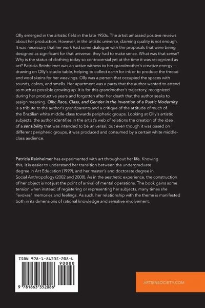 Olly emerged in the artistic field in the late 1950s. The artist amassed positive reviews about her production. However, in the artistic universe, claiming quality is not enough. It was necessary that her work had some dialogue with the proposals that were being designed as significant for that universe: they had to make sense. What was that sense? Why is the status of clothing today so controversial yet at the time it was recognized as art? Patricia Reinheimer was an active witness to her grandmother's creative energy—drawing on Olly’s studio table, helping to collect earth for ink or to produce the thread and wool skeins for her weavings. Olly was a person that occupied the spaces with sounds, colors, and smells. Her apartment was a party that the author wanted to attend as much as possible growing up. It is for this grandmother's trajectory, recognized during her productive years and forgotten after her death that the author seeks to assign meaning. Olly: Race, Class, and Gender in the Invention of a Rustic Modernity is a tribute to the author’s grandparents and a critique of the attitude of much of the Brazilian white middle-class towards peripheric groups. Looking at Olly’s artistic subjects, the author identifies in the artist’s web of relations the creation of the idea of a sensibility that was intended to be universal, but even though it was based on different peripheric groups, it was produced and consumed by a certain white middle-class audience.