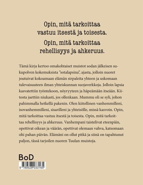 Tämä kirja kertoo omakohtaiset muistot sodan jälkeisen sukupolven kokemuksista ¿sotalapsinä, ajasta, jolloin nuoret joutuivat kokoamaan elämän sirpaleita yhteen ja uskomaan tulevaisuuteen ilman yhteiskunnan suojaverkkoja. Jolloin lapsia kasvatettiin työntekoon, nöyryyteen ja häpeämään itseään. Kiitosta jaettiin niukasti, jos ollenkaan. Mummu oli se syli, johon pahimmalla hetkellä pakenin. Olen kiitollinen vanhemmilleni, isovanhemmilleni, sisarilleni ja yhteisölle, missä kasvoin. Opin, mitä tarkoittaa vastuu itsestä ja toisesta. Opin, mitä tarkoittaa rehellisyys ja ahkeruus. Vanhempani taistelivat eteenpäin, opettivat oikean ja väärän, opettivat olemaan vahva, katsomaan ohi pahan päivän. Elämäni on ollut pitkä ja siinä on tapahtunut paljon, tässä tarjoilen vain nuoren Tuulan muistoja.