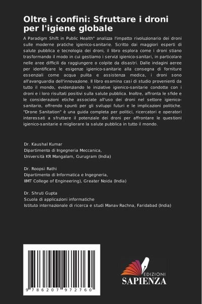 A Paradigm Shift in Public Health" analizza l'impatto rivoluzionario dei droni sulle moderne pratiche igienico-sanitarie. Scritto dai maggiori esperti di salute pubblica e tecnologia dei droni, il libro esplora come i droni stiano trasformando il modo in cui gestiamo i servizi igienico-sanitari, in particolare nelle aree difficili da raggiungere o colpite da disastri. Dalle indagini aeree per identificare le esigenze igienico-sanitarie alla consegna di forniture essenziali come acqua pulita e assistenza medica, i droni sono all'avanguardia dell'innovazione. Il libro esamina casi di studio provenienti da tutto il mondo, evidenziando le iniziative igienico-sanitarie condotte con i droni e i loro risultati positivi sulla salute pubblica. Inoltre, affronta le sfide e le considerazioni etiche associate all'uso dei droni nel settore igienico-sanitario, offrendo spunti per gli sviluppi futuri e le implicazioni politiche. "Drone Sanitation" è una guida completa per politici, ricercatori e operatori interessati a sfruttare il potenziale dei droni per affrontare le questioni igienico-sanitarie e migliorare la salute pubblica in tutto il mondo.