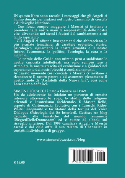 In questo libro sono raccolti i messaggi che gli Angeli ci hanno donato per aiutarci nel nostro cammino di crescita e di risveglio interiore in direzione della Nuova Era Planetaria. Nel rispondere alle nostre domande gli Angeli ci offrono insegnamenti che abbracciano le più svariate tematiche: di carattere esoterico, storico, psicologico, riguardanti la nostra attualità e il nostro futuro, il nostro sistema economico, la politica, l'ecologia, la cura e la malattia... Le parole delle Guide non mirano però a soddisfare le nostre curiosità intellettuali, ma sono sempre tese a stimolare la nostra crescita ed evoluzione e a guidarci nel superamento dei nostri blocchi e condizionamenti. In questo momento così cruciale, così ricco di opportunità nella storia della coscienza planetaria, i Maestri ci invitano a riconoscere il nostro potere e ad assumere pienamente il nostro ruolo di "Architetti della Nuova Era", così come Loro amano definirci.