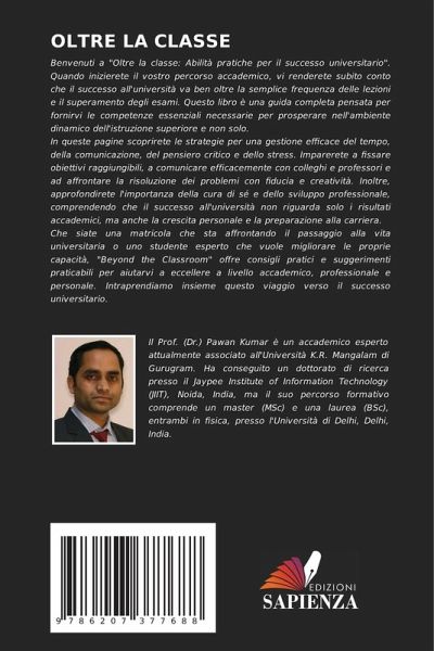 Benvenuti a "Oltre la classe: Abilità pratiche per il successo universitario". Quando inizierete il vostro percorso accademico, vi renderete subito conto che il successo all'università va ben oltre la semplice frequenza delle lezioni e il superamento degli esami. Questo libro è una guida completa pensata per fornirvi le competenze essenziali necessarie per prosperare nell'ambiente dinamico dell'istruzione superiore e non solo.In queste pagine scoprirete le strategie per una gestione efficace del tempo, della comunicazione, del pensiero critico e dello stress. Imparerete a fissare obiettivi raggiungibili, a comunicare efficacemente con colleghi e professori e ad affrontare la risoluzione dei problemi con fiducia e creatività. Inoltre, approfondirete l'importanza della cura di sé e dello sviluppo professionale, comprendendo che il successo all'università non riguarda solo i risultati accademici, ma anche la crescita personale e la preparazione alla carriera.Che siate una matricola che sta affrontando il passaggio alla vita universitaria o uno studente esperto che vuole migliorare le proprie capacità, "Beyond the Classroom" offre consigli pratici e suggerimenti praticabili per aiutarvi a eccellere a livello accademico, professionale e personale. Intraprendiamo insieme questo viaggio verso il successo universitario.