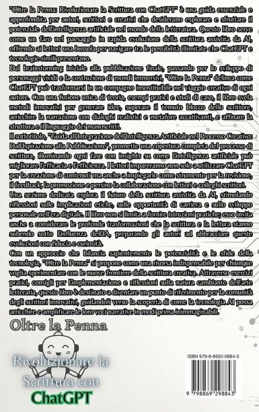 "Oltre la Penna: Rivoluzionare la Scrittura con ChatGPT" è una guida essenziale e approfondita per autori, scrittori e creativi che desiderano esplorare e sfruttare il potenziale dell'intelligenza artificiale nel mondo della letteratura. Questo libro serve come un faro nel paesaggio in rapida evoluzione della scrittura assistita da AI, offrendo ai lettori una bussola per navigare tra le possibilità illimitate che ChatGPT e tecnologie simili presentano. Dal brainstorming iniziale alla pubblicazione finale, passando per lo sviluppo di personaggi vividi e la costruzione di mondi immersivi, "Oltre la Penna" delinea come ChatGPT può trasformarsi in un compagno insostituibile nel viaggio creativo di ogni autore. Con una fusione unica di teoria, esempi pratici e studi di caso, il libro svela metodi innovativi per generare idee, superare il temuto blocco dello scrittore, arricchire la narrazione con dialoghi realistici e metafore accattivanti, e affinare la struttura e il linguaggio dei manoscritti. Il sottotitolo, "Guida all'Integrazione dell'Intelligenza Artificiale nel Processo Creativo: Dall'Ispirazione alla Pubblicazione", promette una copertura completa del processo di scrittura, illuminando ogni fase con insights su come l'intelligenza artificiale può migliorare l'efficacia e l'efficienza. I lettori impareranno non solo a utilizzare ChatGPT per la creazione di contenuti ma anche a impiegarlo come strumento per la revisione, il feedback, la promozione e persino la collaborazione con lettori e colleghi scrittori. Una sezione dedicata esplora il futuro della scrittura assistita da AI, stimolando riflessioni sulle implicazioni etiche, sulle opportunità di carriera e sullo sviluppo personale nell'era digitale. Il libro non si limita a fornire istruzioni pratiche; esso invita anche a considerare le profonde trasformazioni che la scrittura e la lettura stanno subendo sotto l'influenza dell'IA, preparando gli autori ad abbracciare queste evoluzioni con fiducia e curiosità. Con un approccio che bilancia sapientemente le potenzialità e le sfide della tecnologia, "Oltre la Penna" si propone come una risorsa indispensabile per chiunque voglia sperimentare con le nuove frontiere della scrittura creativa. Attraverso esercizi pratici, consigli per l'implementazione e riflessioni sulla natura cambiante dell'arte letteraria, questo libro è destinato a diventare un punto di riferimento per la comunità degli scrittori innovativi, guidandoli verso la scoperta di come la tecnologia AI possa arricchire e amplificare le loro voci narrative in modi prima inimmaginabili.