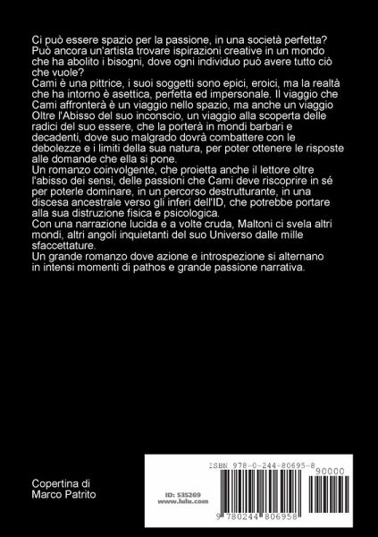 Ci può essere spazio per la passione, in una società perfetta? Può ancora un'artista trovare ispirazioni in un mondo che ha abolito i bisogni, dove ogni individuo può avere tutto ciò che vuole? Cami è una pittrice, i suoi soggetti sono epici, eroici, ma la realtà che ha intorno è asettica, perfetta ed impersonale. Il viaggio che Cami affronterà è un viaggio nello spazio, ma anche un viaggio Oltre l'Abisso del suo inconscio, alla scoperta delle radici dell'essere. Un romanzo coinvolgente, che proietta anche il lettore oltre l'abisso dei sensi, delle passioni che Cami deve riscoprire in sé per poterle dominare, in un percorso destrutturante, in una discesa ancestrale verso gli inferi dell'ID, che potrebbe portare alla sua distruzione fisica e psicologica. Con una narrazione lucida e a volte cruda, Maltoni ci svela altri mondi, altri angoli inquietanti del suo Universo dalle mille sfaccettature.