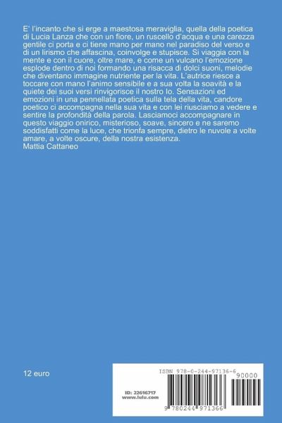 E' l'incanto che si erge a maestosa meraviglia, quella della poetica di Lucia Lanza che con un fiore, un ruscello d'acqua e una carezza gentile ci porta e ci tiene mano per mano nel paradiso del verso e di un lirismo che affascina, coinvolge e stupisce. Si viaggia con la mente e con il cuore, oltre mare, e come un vulcano l'emozione esplode dentro di noi formando una risacca di dolci suoni, melodie che diventano immagine nutriente per la vita. L'autrice riesce a toccare con mano l'animo sensibile e a sua volta la soavità e la quiete dei suoi versi rinvigorisce il nostro Io. Sensazioni ed emozioni in una pennellata poetica sulla tela della vita, candore poetico ci accompagna nella sua vita e con lei riusciamo a vedere e sentire la profondità della parola. Lasciamoci accompagnare in questo viaggio onirico, misterioso, soave, sincero e ne saremo soddisfatti come la luce, che trionfa sempre, dietro le nuvole a volte amare, a volte oscure, della nostra esistenza. Mattia Cattaneo