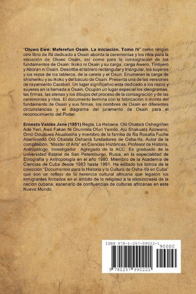Como ningún otro libro de Ifá dedicado a Osain aborda la ceremonias y los ritos para la iniciación de Oluwo Osain, así como para la consagración de los fundamentos de Osain: Ikoko ni Osain y su carga, carga Awero, Tintiyero y Aboran ni Osain. Describe el tablero rectangular y triangular, los suyeres y los rezos de los tableros, de la careta y el Osun. Enumeran la carga de shisheriku y su ikoko y del báculo de Osain. Presenta una de las versiones de rayamiento Carabalí. Un lugar significativo esta dedicado a los rezos y súyeres en la llamada a Osain. Ocupan un lugar especial los ideogramas, las firmas, las atenas y los dibujos del proceso de la consagración y de las ceremonias y ritos. El documento termina con la fabricación o monta del fundamento de Osain y sus firmas, los nombres de Osain en diferentes circunstancias y el diagrama del juramento de Osain para el reconocimiento del Poder.
