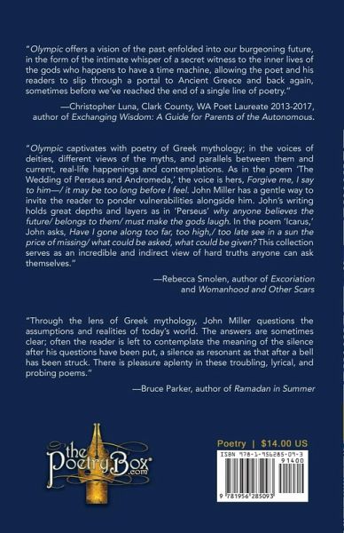 Olympic, by John L. Miller, is a dynamic collection of personal, persona, and pandemic poems inspired by various Greek mythological tales, guided by Robert Graves' The Greek Myths. Throughout the book, John Miller masterfully employs this mythology as a creative vehicle to both witness and contemplate the current realities of life against a backdrop of history and legend. "Olympic offers a vision of the past enfolded into our burgeoning future, in the form of the intimate whisper of a secret witness to the inner lives of the gods who happens to have a time machine, allowing the poet and his readers to slip through a portal to Ancient Greece and back again, sometimes before we've reached the end of a single line of poetry." -Christopher Luna, Clark County, WA Poet Laureate 2013-2017 "Through the lens of Greek mythology, John Miller questions the assumptions and realities of today's world. The answers are sometimes clear; often the reader is left to contemplate the meaning of the silence after his questions have been put, a silence as resonant as that after a bell has been struck. There is pleasure aplenty in these troubling, lyrical, and probing poems." -Bruce Parker, author of Ramadan in Summer