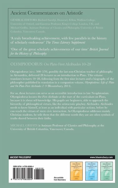 This open access book looks at Olympiodorus (AD c. 500-570), possibly the last non-Christian teacher of philosophy in Alexandria, who delivered 28 lectures as an introduction to Plato. This volume translates lectures 10-28, following from the first nine lectures and a biography of the philosopher published in translation in a companion volume, Olympiodorus: Life of Plato and On Plato First Alcibiades 1-9 (Bloomsbury, 2014). For us, these lectures can serve as an accessible introduction to late Neoplatonism. Olympiodorus locates the First Alcibiades at the start of the curriculum on Plato, because it is about self-knowledge. His pupils are beginners, able to approach the hierarchy of philosophical virtues, like the aristocratic playboy Alcibiades. Alcibiades needs to know himself, at least as an individual with particular actions, before he can reach the virtues of mere civic interaction. As Olympiodorus addresses mainly Christian students, he tells them that the different words they use are often symbols of truths shared between their faiths. The ebook editions of this book are available open access under a CC BY-NC-ND 4.0 licence on bloomsburycollections.com. Open access was funded by The University of British Columbia.