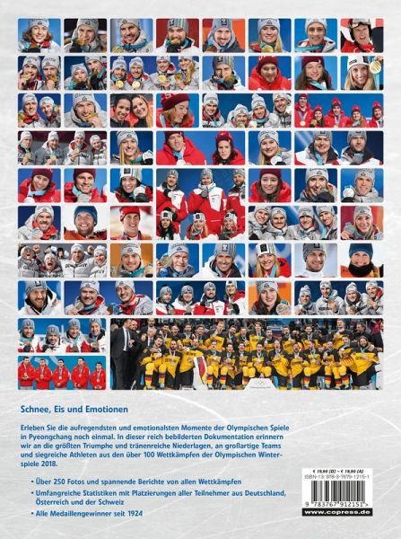 Spannende olympische Tage liegen hinter uns. Ein gefühlter Medaillenregen prasselte auf die deutschen Athleten in Pyeongchang herab. Sei es die Goldmedaille für die überragende Kür im Eispaarlauf von Savchenko und Massot, Silber für die deutschen Eishockeyspieler nach einem wahren Match-Krimi gegen Russland oder die drei Medaillen der Laura Dahlmeier, dem deutschen Biathlonwunder. Klar ist: wir wollen diese Tage nicht vergessen! Deshalb finden Sie in dieser reich bebilderten Dokumentation zu den Olympischen Winterspielen von 2018 alles, was es an Statistiken, Bildern und Hintergrundreportagen zu wissen gilt, um die Tage von Pyeongchang noch einmal glanzvoll Revue passieren zu lassen.- Über 250 Fotos und spannende Berichte von allen Wettkämpfen- Umfangreiche Statistiken mit Platzierungen aller Teilnehmer aus Deutschland, Österreich und der Schweiz- Alle Medaillengewinner seit 1924