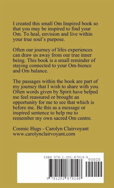 I created this small Om Inspired book so that you may be inspired to find your Om. To heal, envision and live within your true soul's purpose. Often our journey of lifes experiences can draw us away from our true inner being. This book is a small reminder of staying connected to your Om-bience and Om balance. The passages within the book are part of my journey that I wish to share with you. Often words given by Spirit have helped me feel reassured or brought an opportunity for me to see that which is before me. Be this as a message or inspired sentence to help me to remember my own sacred Om centre.