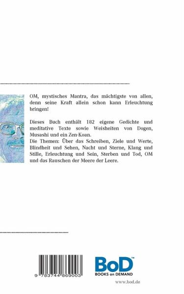 OM, mystisches Mantra, das mächtigste von allen, denn seine Kraft allein schon kann Erleuchtung bringen! 182 Gedichte und meditative Texte sowie Weisheiten von Dogen, John Cage, Musashi und ein Zen-Koan.Die Kapitel: Einklang, OM, Vom Schreiben, Drinnen bei dir, Draußen in Natur und Stadt, Von Zielen und Werten, Blind und sehend, Die Gitter der Zeit, Klang, Ich bin - wir sind, Traumtraum, Nacht und Sterne, Stille ist, Erleuchtung, Sterben und Tod, Das Rauschen der Meere der Leere, Ausklang.lyrik: worte / wie sterne in klarer nacht / sätze / gewoben aus träumen von licht / gedankennetze / so soll lyrik seinwir sind ein teil: wir sind / ein teil des ganzen / das ganze ist / ein teil von uns / in uns / träumen / alle weltensatori: kehre zurück / in die große leere / die in dir schlummert / seit anbeginn / wirf ab / ICH ICH ICH / wirf ab / und / werde eins