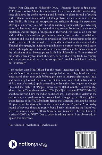 Author {Post Graduate in Philosophy (M.A. - Previous), living in Spain since 1995 Known as Roy Ashutosh, a great lover of television and radio broadcasting, since childhood he prefers traveling and listening to elders instead of playing with children, more interested in all things classic}'s only desire is to achieve Yatra Siddhi. He brings us introspection and reflection through his experiences offering us a new way to tackle one of humanity's greatest challenges, achieving peace and harmony on our planet and solving core problems such as the role of capitalism and the origins of inequality in the world. He takes us on a journey with a global vision and an open heart to remind us that the true religion is humanity and love and compassion towards our fellow human beings is the only motherland and all this through a very multifaceted look at the country India. Through these pages, he invites us to join him on a journey towards world peace, where each step brings us a little closer to the desired ideal of harmony among all the inhabitants of our beloved planet Earth. His philosophy is: "I am a citizen of the world, where my feet touch the earth's surface, that is my land, my country and the people around me are my compatriots". And his religion is nothing but "Humanity".