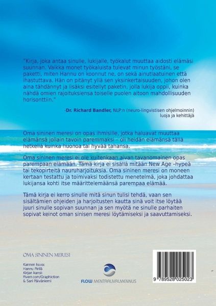 "Kirja, joka antaa sinulle, lukijalle, työkalut muuttaa aidosti elämäsi suunnan. Vaikka monet työkaluista tulevat minun työstäni, se paketti, miten Hannu on koonnut ne, on sekä ainutlaatuinen että ihastuttava. Hän on pitänyt yllä sen yksinkertaisuuden, johon olen aina tähdännyt ja lisäksi esitellyt paketin, jolla lukija oppii kuinka nähdä omien rajoituksiensa toiselle puolen aitoon mahdollisuuden horisonttiin." -Dr. Richard Bandler, NLP:n (neuro-lingvistisen ohjelmoinnin) luoja ja kehittäjä Oma sininen meresi on opas sinulle, joka haluat muuttaa elämäsi jollain tavoin paremmaksi - oli elämäsi tällä hetkellä kuinka huonoa tai hyvää tahansa. Oma sininen meresi ei ole kuitenkaan aivan tavanomainen opas parempaan elämään. Tämä kirja ei sisällä mitään New Age -hypeä tai tekopirteitä nauruharjoituksia. Oma sininen meresi on moneen kertaan testattu ja toimivaksi todistettu menetelmä, joka johdattaa sinut kohti itse määrittelemääsi parempaa elämää. Tämä kirja ei kerro sinulle mitä sinun tulisi tehdä, vaan sen sisältämien ohjeiden ja harjoitusten kautta sinä voit itse löytää juuri sinulle sopivan suunnan ja sen myötä ne sinulle parhaiten sopivat keinot oman sinisen meresi löytämiseksi ja saavuttamiseksi.
