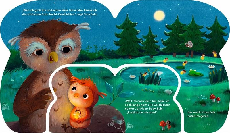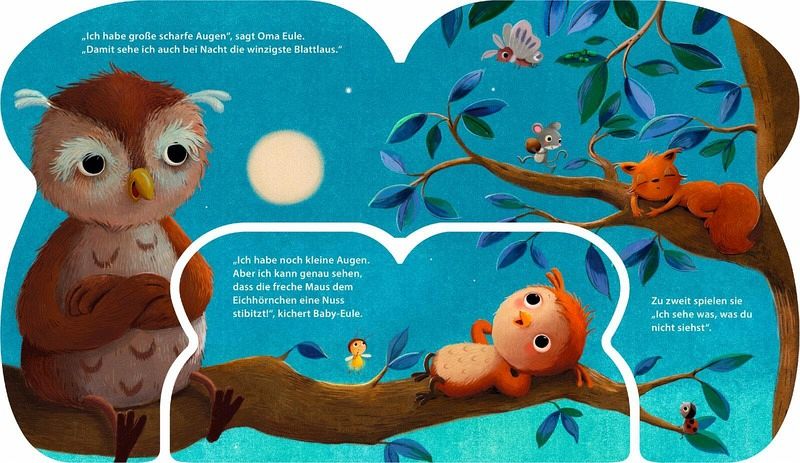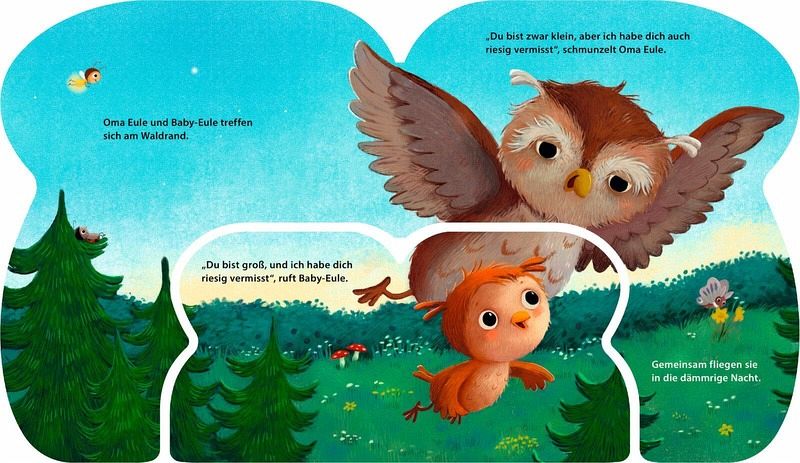 Nicht nur das große und das kleine Pappebuch gehören unzertrennlich zusammen, sondern auch Oma Eule und ihr kleiner Liebling! Oma Eule lebt schon so viele Jahre im Wald, dass sie viele wunderbare Geschichten zu erzählen weiß. Sie kann ihren Kopf so weit drehen, dass sie Baby-Eule immer im Blick hat und wenn Baby-Eule müde ist, sind ihre weichen Flügel die perfekte Kuscheldecke!