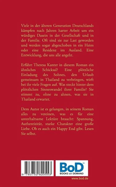 Viele in der älteren Generation Deutschlands kämpfen nach Jahren harter Arbeit um ein würdiges Dasein in der Gesellschaft und in der Familie. Oft sind sie zur Last geworden und werden sogar abgeschoben in ein Heim oder eine Residenz im Ausland. Eine Entwicklung, die uns alle angeht.Erfährt Theresa Kanter in diesem Roman ein ähnliches Schicksal? Eine plötzliche Einladung des Sohnes, den Urlaub gemeinsam in Thailand zu verbringen, wirft bei ihr viele Fragen auf. Was steckt hinter dem plötzlichen Sinneswandel ihrer Familie? Sie stimmt zu, ohne zu ahnen, was sie in Thailand erwartet.Dem Autor ist es gelungen, in seinem Roman alles zu vereinen, was es für eine unterhaltsame Lektüre braucht: Spannung, Authentizität, starke Charakter eine große Liebe. Ob es auch ein Happy End gibt. Lesen Sie selbst.
