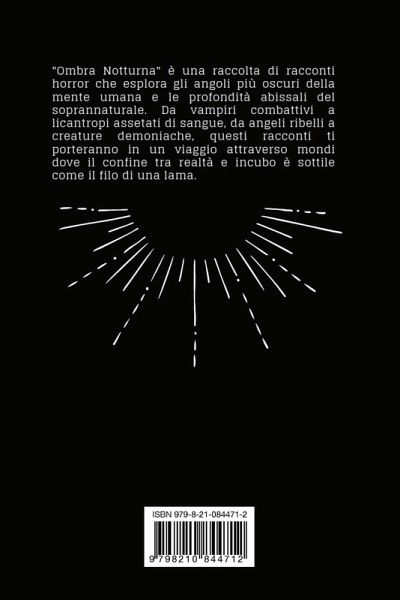 "Ombra Notturna" è una raccolta di racconti horror che esplora gli angoli più oscuri della mente umana e le profondità abissali del soprannaturale. Da vampiri combattivi a licantropi assetati di sangue, da angeli ribelli a creature demoniache, questi racconti ti porteranno in un viaggio attraverso mondi dove il confine tra realtà e incubo è sottile come il filo di una lama.
