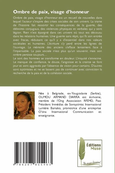 Ombre de paix, visage d'honneur est un recueil de nouvelles dans lequel l'auteur s'inspire des crises sociales de son univers. La trame de l'histoire fait ressortir les conséquences de la guerre, des déboires conjugaux, des violences physiques et verbales qui y sont légion. Rien n'est épargné dans cet univers où tout est décousu dans les relations humaines. Une guerre sans répit, qui fit son entrée avec fracas, réduisant ce qu'il y a d'essentiel dans nos valeurs sociétales et humaines. L'écriture s'y perd entre les lignes de l'ouvrage. La mémoire des anciens s'efface lentement face à l'impensable. La paix sociale n'est plus qu'un souvenir, mais son ombre persiste toujours...Le sort des hommes se transforme en douleur. L'iniquité s'enracine. Le manque de confiance, le doute, l'angoisse et la crainte se font jour et sont aggravés par l'absence de vision pour certains. D'autres sont optimistes et ne se lassent pas de continuer avec conviction la recherche de la paix et de la cohésion sociale.