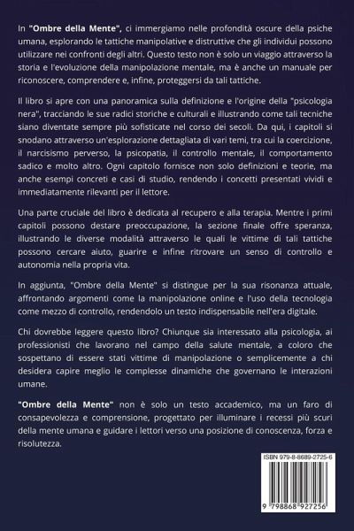 In "Ombre della Mente", ci immergiamo nelle profondità oscure della psiche umana, esplorando le tattiche manipolative e distruttive che gli individui possono utilizzare nei confronti degli altri. Questo testo non è solo un viaggio attraverso la storia e l'evoluzione della manipolazione mentale, ma è anche un manuale per riconoscere, comprendere e, infine, proteggersi da tali tattiche. Il libro si apre con una panoramica sulla definizione e l'origine della "psicologia nera", tracciando le sue radici storiche e culturali e illustrando come tali tecniche siano diventate sempre più sofisticate nel corso dei secoli. Da qui, i capitoli si snodano attraverso un'esplorazione dettagliata di vari temi, tra cui la coercizione, il narcisismo perverso, la psicopatia, il controllo mentale, il comportamento sadico e molto altro. Ogni capitolo fornisce non solo definizioni e teorie, ma anche esempi concreti e casi di studio, rendendo i concetti presentati vividi e immediatamente rilevanti per il lettore. Una parte cruciale del libro è dedicata al recupero e alla terapia. Mentre i primi capitoli possono destare preoccupazione, la sezione finale offre speranza, illustrando le diverse modalità attraverso le quali le vittime di tali tattiche possono cercare aiuto, guarire e infine ritrovare un senso di controllo e autonomia nella propria vita. In aggiunta, "Ombre della Mente" si distingue per la sua risonanza attuale, affrontando argomenti come la manipolazione online e l'uso della tecnologia come mezzo di controllo, rendendolo un testo indispensabile nell'era digitale. Chi dovrebbe leggere questo libro? Chiunque sia interessato alla psicologia, ai professionisti che lavorano nel campo della salute mentale, a coloro che sospettano di essere stati vittime di manipolazione o semplicemente a chi desidera capire meglio le complesse dinamiche che governano le interazioni umane. "Ombre della Mente" non è solo un testo accademico, ma un faro di consapevolezza e comprensione, progettato per illuminare i recessi più scuri della mente umana e guidare i lettori verso una posizione di conoscenza, forza e risolutezza.