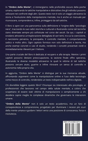In "Ombre della Mente", ci immergiamo nelle profondità oscure della psiche umana, esplorando le tattiche manipolative e distruttive che gli individui possono utilizzare nei confronti degli altri. Questo testo non è solo un viaggio attraverso la storia e l'evoluzione della manipolazione mentale, ma è anche un manuale per riconoscere, comprendere e, infine, proteggersi da tali tattiche. Il libro si apre con una panoramica sulla definizione e l'origine della "psicologia nera", tracciando le sue radici storiche e culturali e illustrando come tali tecniche siano diventate sempre più sofisticate nel corso dei secoli. Da qui, i capitoli si snodano attraverso un'esplorazione dettagliata di vari temi, tra cui la coercizione, il narcisismo perverso, la psicopatia, il controllo mentale, il comportamento sadico e molto altro. Ogni capitolo fornisce non solo definizioni e teorie, ma anche esempi concreti e casi di studio, rendendo i concetti presentati vividi e immediatamente rilevanti per il lettore. Una parte cruciale del libro è dedicata al recupero e alla terapia. Mentre i primi capitoli possono destare preoccupazione, la sezione finale offre speranza, illustrando le diverse modalità attraverso le quali le vittime di tali tattiche possono cercare aiuto, guarire e infine ritrovare un senso di controllo e autonomia nella propria vita. In aggiunta, "Ombre della Mente" si distingue per la sua risonanza attuale, affrontando argomenti come la manipolazione online e l'uso della tecnologia come mezzo di controllo, rendendolo un testo indispensabile nell'era digitale. Chi dovrebbe leggere questo libro? Chiunque sia interessato alla psicologia, ai professionisti che lavorano nel campo della salute mentale, a coloro che sospettano di essere stati vittime di manipolazione o semplicemente a chi desidera capire meglio le complesse dinamiche che governano le interazioni umane. "Ombre della Mente" non è solo un testo accademico, ma un faro di consapevolezza e comprensione, progettato per illuminare i recessi più scuri della mente umana e guidare i lettori verso una posizione di conoscenza, forza e risolutezza.