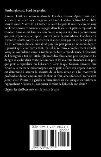 Pittsburgh est au bord du gouffre. Kannan Leith est nouveau dans le Hadden Coven. Après qu'un vieil adversaire ait lancé un sortilège sur le Centre Hadden et laissé l'Assemblée sous le choc, Maître Nik Hadden a lancé l'appel. Il avait besoin de sang neuf, de nouveaux guerriers engagés dans la cause et prêts à rejoindre le combat. Kannan est l'un des nombreux vampires et autres paranormaux qui ont répondu à cet appel, prêts à jurer devant Maître Hadden et à rejoindre la lutte contre les ténèbres. Kannan n'est pas un jeune vampire et il a vu certaines choses, mais il est plus que prêt pour un nouveau départ. Il pensait qu'il était prêt à tout, mais il se retrouve complètement aveuglé lorsqu'au cours d'une soirée, il tombe sur sa bien-aimée destinée. L'obscurité de l'hexagone a fait de Pittsburgh un endroit beaucoup plus dangereux. Le danger se cache dans toutes les ombres et les mauvais éléments sont plus que prêts à capitaliser sur l'obscurité. C'est là que Kannan retrouve Eric Bruce, à la merci de métamorphes loups prêts à faire des dégâts. Kannan est déterminé à assurer la sécurité de sa bien-aimée et à lui montrer la profondeur de son amour, mais le chemin n'est jamais facile et l'avenir n'est jamais clair. Pourra-t-il garder sa bien-aimée en vie lorsque les ombres se rapprochent ? Pourra-t-il conquérir le c¿ur de l'objet de son désir ? Quand les ténèbres arrivent, le destin éclaire.