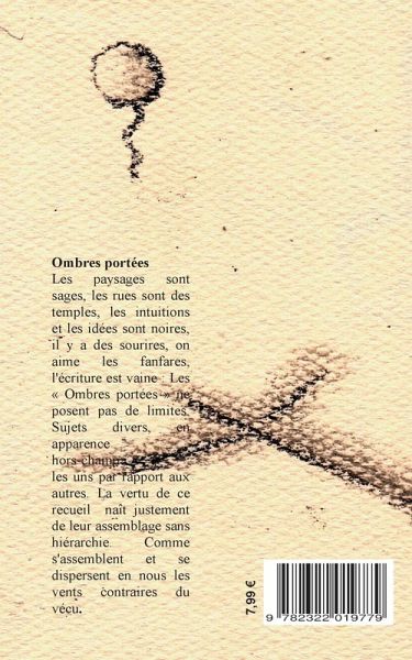 Ombres portéesLes paysages sont sages, les rues sont des temples, les intuitions et les idées sont noires, il y a des sourires, on aime les fanfares, l'écriture est vaine : Les « Ombres portées » ne posent pas de limites. Sujets divers, en apparence hors-champ les uns par rapport aux autres. La vertu de ce recueil naît justement de leur assemblage sans hiérarchie.Comme s'assemblent et se dispersent en nous les vents contraires du vécu.