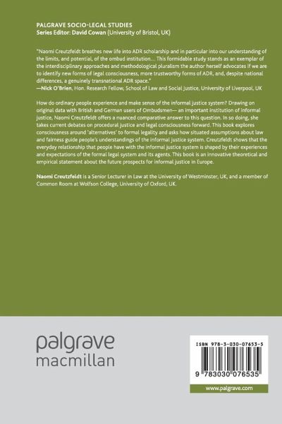 How do ordinary people experience and make sense of the informal justice system? Drawing on original data with British and German users of Ombudsmen- an important institution of informal justice, Naomi Creutzfeldt offers a nuanced comparative answer to this question. In so doing, she takes current debates on procedural justice and legal consciousness forward. This book explores consciousness around 'alternatives' to formal legality and asks how situated assumptions about law and fairness guide people's understandings of the informal justice system. Creutzfeldt shows that the everyday relationship that people have with the informal justice system is shaped by their experiences and expectations of the formal legal system and its agents. This book is an innovative theoretical and empirical statement about the future prospects for informal justice in Europe.
