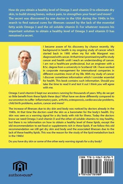 The book, "Omega 3 and vitamin D secrets! How do you obtain a healthy level of Omega 3 and vitamin D these days?" , contains new information about an old discovery made by a doctor in biochemistry in the USA in the 1940s. With his research he discovered why most people do not get much health benefit from the meals with wild fish, free range eggs, grass feed beef and fish supplements. For whatever reasons his important discovery and solution to obtain a healthy level of Omega 3 and vitamin D plus the other lipids has remained a secret to most people. With his research, the doctor discovered that very little of the important lipids in marine oil or food rich in these lipids would reach all the cells in the skin and body with the normal method of eating and drinking. Already at that time it was noticed that a lot of people got dry skin and body with the associated illnesses. These days some doctors involved in the research of these important lipids think we have reached a worldwide vitamin D deficiency of epidemic proportions with more than 1 billion people at risk for associated illnesses. As soon as you understand how our modern way of life have influenced our digestion, absorption and transport of the essential fatty acid Omega 3 and the oil soluble vitamin D in the body, compared to previous generations, it should be easier to understand why many people get dry skin and body these days. With this knowledge, it should also be easier to understand what you need to do to obtain a healthy level of Omega 3 and vitamin D together with the other oil soluble vitamins to correct or avoid dry skin and body, and the associated illnesses. What are these associated illnesses? According to scientific research lack of these important lipids cause oxidative stress or inflammation at the cellular level. Most of our serious illnesses related to heart, arteries, arthritis, osteoporosis, lung, asthma, diabetes, kidney, eyes, cancer etc and not so serious illnesses such as dry ski, dry hair, bleeding gums, depression, digestive problems, pain, hearing loss etc seem to develop because of oxidative stress or inflammation at the cellular level. Add fertility problems, autism and birth complications and... What is a healthy level of these important lipids and how can I be sure that I have a healthy level of these lipids? This is what the doctor in biochemistry discovered back in the 1940s. With this information your starting question could be: What changes have we made to our way of living and eating compared to previous generations which give us lack of the essential fatty acids Omega 3 and the oil soluble vitamin D? That information and much more is the topic of the book!