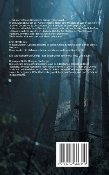 --- inklusive Bonus-Geschichte Omega - Dschungel ---In den Aufzeichnungen der Ahnen entdeckt Natan eine Möglichkeit Wesen aus einer anderen Dimension zu beschwören. Damit entfacht er den Kampf um die Vorherrschaft auf der Insel Samica. Er bezahlt dafür mit dem Leben. Sein Sohn Eran versucht sein Erbe anzutreten, doch die Gefühle für Chrissa, der Tochter eines Händlers, drohen seine Pläne durcheinander zu bringen.Wofür wird er sich entscheiden? Macht oder Liebe?Eran atmete aus.In zwei Stunden. Das Blut rauschte in seinen Ohren. Er spürte jeden Schlag seines Herzens.Dann werden die Kilrhains erfahren, wer die neuen Herren Samicas sind.Die Vorgeschichte zu Omega - Der Engel Gottes spielt etwa 1000 Jahre zuvor.Bonusgeschichte Omega - Dschungel:Die Lieferung eines geheimen Stoffes aus dem Dschungel Carthes ist lange überfällig; die ausgeschickten Jäger werden vermisst. Der erste Jäger des Ostens bricht mit drei Anwärtern auf, um das Schicksal der zwei Dschungelsiedlungen zu klären. Inder grünen Hölle Carthes begegnet ihnen das Grauen und eine Gefahr für die Menschheit.Mit diesen beiden Geschichten erhaltet ihr eine Einführung die Welt von "Omega - Der Engel Gottes".Bisher erschienen:Omega - Die Zauberer--------- ca. 1000 Jahre -------Omega - Dschungel (Kurzgeschichte)Omega - Der Engel Gottes