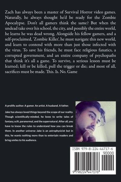Zach has always been a master of Survival Horror video games. Naturally, he always thought he'd be ready for the Zombie Apocalypse. Don't all gamers think the same? But when the undead take over his school, the city, and possibly the entire world, he learns he was dead wrong. Alongside his fellow gamers, and a self-proclaimed, 'Zombie Killer', he must navigate this new world, and learn to contend with more than just those infected with the virus. To save his friends, he must face religious fanatics, a corrupted government, and an entire company of psychopaths that think it's all a game. To survive, a serious lesson must be learned; kill or be killed, pull the trigger or die; and most of all, sacrifices must be made. This. Is. No. Game