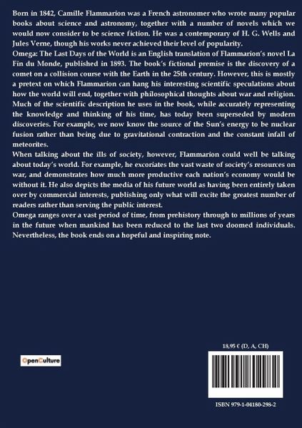 Born in 1842, Camille Flammarion was a French astronomer who wrote many popular books about science and astronomy, together with a number of novels which we would now consider to be science fiction. He was a contemporary of H. G. Wells and Jules Verne, though his works never achieved their level of popularity. Omega: The Last Days of the World is an English translation of Flammarion¿s novel La Fin du Monde, published in 1893. The book¿s fictional premise is the discovery of a comet on a collision course with the Earth in the 25th century. However, this is mostly a pretext on which Flammarion can hang his interesting scientific speculations about how the world will end, together with philosophical thoughts about war and religion. Much of the scientific description he uses in the book, while accurately representing the knowledge and thinking of his time, has today been superseded by modern discoveries. For example, we now know the source of the Sun¿s energy to be nuclear fusion rather than being due to gravitational contraction and the constant infall of meteorites. When talking about the ills of society, however, Flammarion could well be talking about today¿s world. For example, he excoriates the vast waste of society¿s resources on war, and demonstrates how much more productive each nation¿s economy would be without it. He also depicts the media of his future world as having been entirely taken over by commercial interests, publishing only what will excite the greatest number of readers rather than serving the public interest. Omega ranges over a vast period of time, from prehistory through to millions of years in the future when mankind has been reduced to the last two doomed individuals. Nevertheless, the book ends on a hopeful and inspiring note.