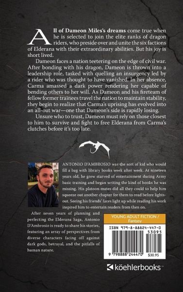 All of Dameon Miles's dreams come true when he is selected to join the elite ranks of dragon riders, who preside over and unite the six factions of Elderana with their extraordinary abilities. But his joy is short lived. Dameon faces a nation teetering on the edge of civil war. After bonding with his dragon, Dameon is thrown into a leadership role, tasked with quelling an insurgency led by a rider who was thought to have vanished. In her absence, Carma amassed a dark power rendering her capable of bending others to her will. As Dameon and his fireteam of fellow former trainees travel the nation to maintain stability, they begin to realize that Carma's uprising has evolved into an all-out war-one that Dameon's side is rapidly losing. Unsure who to trust, Dameon must rely on those closest to him to survive and fight to free Elderana from Carma's clutches before it's too late.