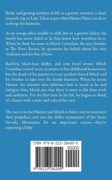 Broke and getting nowhere in life as a genetic scientist, a short research trip to Lake Tahoe is just what Hunter Pierce needs to recharge his batteries. As an omega who's unable to shift due to a genetic defect, his family has never failed to let him know how worthless he is. When he finds his mate in Mitch Carnelian, the sexy hotelier at The Pines Resort, he questions his beliefs about his own weakness and his fear of love. Bad-boy, black-bear shifter, and now hotel owner. Mitch Carnelian vowed never to return to his childhood hometown, but the death of his parents in a car accident forced Mitch and his brother to take over the family business. When he meets Hunter, the scientist who infuriates him as much as he and intrigues him, Mitch sees that there is more to life than work and ambition. For the first time in his life, he begins to think of a future with a mate and cubs of his own. The race is on for Hunter and Mitch to find a way to overcome their prejudices and save the shifter community of the Sierra Nevada Mountains for an important reason—they're expecting a baby. This is a standalone story with a happy ending and no cliffhangers. This story includes explicit love scenes and violence.