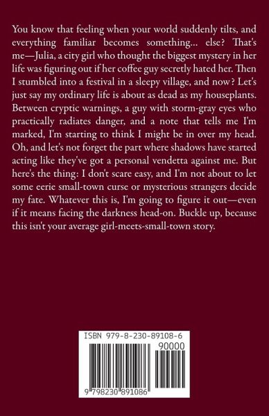 You know that feeling when your world suddenly tilts, and everything familiar becomes something... else? That's me-Julia, a city girl who thought the biggest mystery in her life was figuring out if her coffee guy secretly hated her. Then I stumbled into a festival in a sleepy village, and now? Let's just say my ordinary life is about as dead as my houseplants. Between cryptic warnings, a guy with storm-gray eyes who practically radiates danger, and a note that tells me I'm marked, I'm starting to think I might be in over my head. Oh, and let's not forget the part where shadows have started acting like they've got a personal vendetta against me. But here's the thing: I don't scare easy, and I'm not about to let some eerie small-town curse or mysterious strangers decide my fate. Whatever this is, I'm going to figure it out-even if it means facing the darkness head-on. Buckle up, because this isn't your average girl-meets-small-town story.