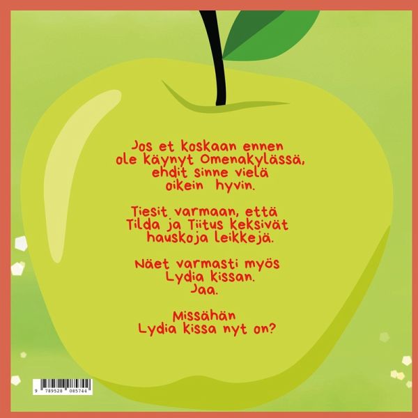 Jos et koskaan ennen ole käynyt Omenakylässä, ehdit sinne vielä oikein hyvin. Tiesit varmaan, että Tilda ja Tiitus keksivät hauskoja leikkejä. Näet varmasti myös Lydia kissan. Jaa. Missähän Lydia kissa nyt on?