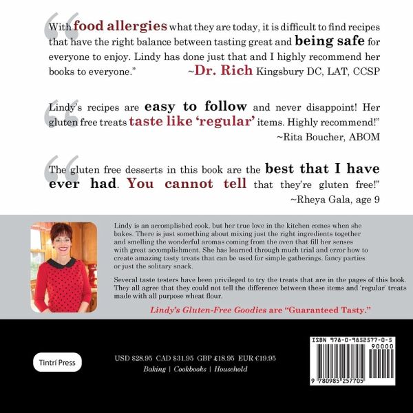 This book with 101 thoroughly tested gluten-free dessert recipes will tantalize your taste buds and have dinner guests begging for more! Real full color photos accompany each dessert. Lindy is an accomplished cook, but her true love in the kitchen comes when she bakes. There is just something about mixing just the right ingredients together and smelling the wonderful aromas coming from the oven that fill her senses with great accomplishment. She has learned through much trial and error how to create amazing tasty treats that can be used for simple gatherings, fancy parties or just the solitary snack. Several taste testers have been privileged to try the treats that are in the pages of this book. They all agree that they could not tell the difference between these items and ‘regular’ treats made with all purpose wheat flour. Lindy’s Gluten-Free Goodies are "Guaranteed Tasty."
