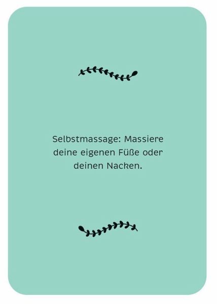 Nimm dir Zeit für dich und tu dir selbst etwas Gutes. Denn so kannst du deine Batterien wieder aufladen, neue Energie tanken und dir lauter kleine Wohlfühl-Oasen erschaffen. Die 50 inspirierenden Karten laden dich dazu ein, im hektischen Alltag einfach mal die Pause-Taste zu drücken. Finde zu einem Leben in Balance und Leichtigkeit.+ 50 zauberhaft illustrierte Karten für kleine Wohlfühl- und Ruhe-Oasen+ für mehr Leichtigkeit, Kreativität und innere Ausgeglichenheit+ ideal für "Me-Time" oder als Geschenk für den_die beste_n Freund_in+ extra große Karten zum Aufstellen, an die Wand hängen oder zum Weiterverschenken+ mit 128-seitigem Booklet zum Eintragen von Erinnerungen, Gedanken und Ideen