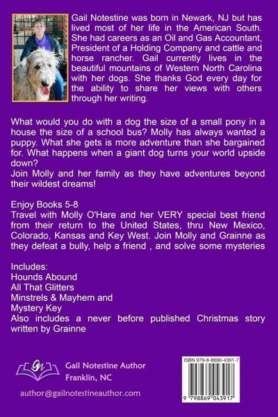 What would you do with a dog the size of a small pony in a house the size of a school bus? Molly has always wanted a puppy. What she gets is more adventure than she bargained for. What happens when a giant dog turns your world upside down? Join Molly and her family as they have adventures beyond their wildest dreams! Enjoy Books 5-8 Travel with Molly O'Hare and her VERY special best friend from their return to the United States, thru New Mexico, Colorado, Kansas and Key West. Join Molly and Grainne as they defeat a bully, help a friend , and solve some mysteries Includes: Hounds Abound All That Glitters Minstrels & Mayhem and Mystery Key Also includes a never before published Christmas story written by Grainne