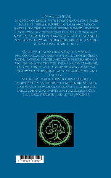 On a Blue Star is a book of lyrics, with some character, bigger than life themes, surprising tales and mood-makers. It continues the previous book, Heart of Earth, way of connecting human feelings and natural elements, but maybe just with enhanced soul gravity by an extraordinary moon magic and strong heart tiding.On a way, it also tells a story. A mental philosophical journey with well chosen Greek Gods, natural forces and love-desire-and-war beginning with chapter themed Moon Maidens, and continue with a mind bending mythical plot by chapters Rome Falls, Atlantis Soul and Lady EA. After that point, themes turn closer to everyday human life by still soul surfing-and-flying and from mood-perspective extremely philosophical-and-intellectual Summer City Sun, Ghost Stories and Little Moodies.