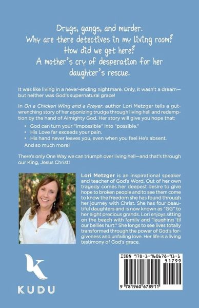 Drugs, gangs, and murder. Why are there detectives in my living room?How did we get here? A mother's cry of desperation for her daughter's rescue. It was like living in a never-ending nightmare. Only, it wasn't a dream-but neither was God's supernatural grace! In On a Chicken Wing and a Prayer, author Lori Metzger tells a gut-wrenching story of her agonizing trudge through living hell and redemption by the hand of Almighty God. Her story will give you hope that:God can turn your "impossible" into "possible." His Love far exceeds your pain. His hand never leaves you, even when you feel He's absent. And so much more! There's only One Way we can triumph over living hell-and that's through our King, Jesus Christ!