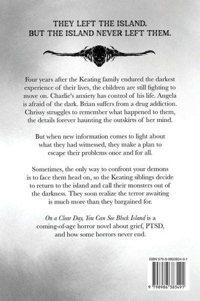 They left the island, but the island never left them. Four years after the Keating family endured the darkest experiences of their lives, the children are still fighting to move on. Charlie's anxiety has control of his life. Angela is afraid of the dark.Brian suffers from a drug addiction. Chrissy struggles to remember what happened to them, the details forever haunting the outskirts of her mind. But when new information comes to light about what they had witnessed, they make a plan to escape their problems once and for all. Sometimes, the only way to confront your demons is to face them head on, so the Keating siblings decide to go back to the island and call their monsters out of the darkness. They soon realize the terror awaiting is much more than they bargained for. On a Clear Day, You Can See Block Island is a coming of age horror novel about grief, PTSD, and how some horrors never end.