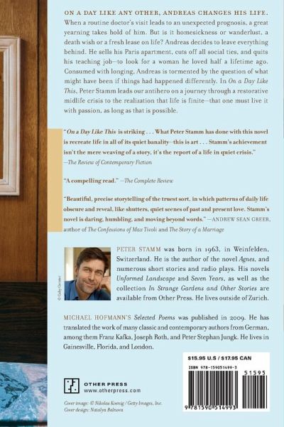 A new novel of artful understatement about mortality, estrangement, and the absurdity of life from the acclaimed author of Unformed Landscape and In Strange Gardens On a day like any other, Andreas changes his life. When a routine doctor's visit leads to an unexpected prognosis, a great yearning takes hold of him-but who can tell if it is homesickness or wanderlust? Andreas leaves everything behind, sells his Paris apartment; cuts off all social ties; quits his teaching job; and waves goodbye to his days spent idly sitting in cafes-to look for a woman he once loved, half a lifetime ago. The monotony of days has been keeping him in check; now he hopes for a miracle and for a new beginning. Andreas' travels lead him back to the province of his youth, back to his hometown in Switzerland where he returns to familiar streets, where his brother still lives in their childhood home, and where Fabienne, a woman he was obsessed with in his youth, visits the same lake they once swam in together. Andreas, still consumed with longing for his lost love and blinded by the uncertainty of his future, is tormented by the question of what might have been if things had happened differently. Peter Stamm has been praised as a "stylistic ascetic" and his prose as "distinguished by lapidary expression, telegraphic terseness, and finely tuned sensitivity" (Bookforum). In On a Day Like This, Stamm's unobtrusive observational style allows us to journey with our antihero through his crises of banality, of living in his empty world, and the realization that life is finite-that one must live it, as long as that is possible. Praise for Unformed Landscape: "Sensitive and unnerving. . . . An uncommonly intimate work, one that will remind the reader of his or her own lived experience with a greater intensity than many of the books that are published right here at home." -The New Republic Online "If Albert Camus had lived in an age when people in remote Norwegian fishing villages had e-mail, he might have written a novel like this."-The New Yorker "Unformed Landscape has a refreshing purity, a lack of delusion, a lack of hype."-Los Angeles Times