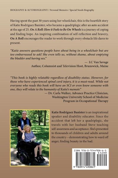 Having spent the past 30 years On A Roll in her power wheelchair, How It Feels To Be On Wheels is the heartfelt story of Katie Rodriguez Banister, who became a quadriplegic after an auto accident at the age of 25 years old. Through extraordinary challenges, she's struggled with anger issues, battled depression, advocated for people with disabilities, and found a great partner in her husband Steve. In Katie's search for self-acceptance, love, and survival, she shares the importance of using humor, laughter, and finding the fun in life to help ourselves on a daily basis. This journey of coping, finding hope and living full-out, is an inspiring combination of self-reflection and bravery, challenging the reader to work through every obstacle life dares to present. About the Author Katie Banister Rodriguez is a spirited, quick witted woman who zips around in her power wheel hair as an Inspirational Speaker and advocate for those with disabilities. She and her husband Steve don't let being On A Roll slow them down! Since the accident that left her a quadriplegic, she's presented to thousands of children and adults in the Midwest - teaching self-awareness, kindness, acceptance and the importance of using humor, and laughter to ward off anger and find the fun in life, every day, no matter what.