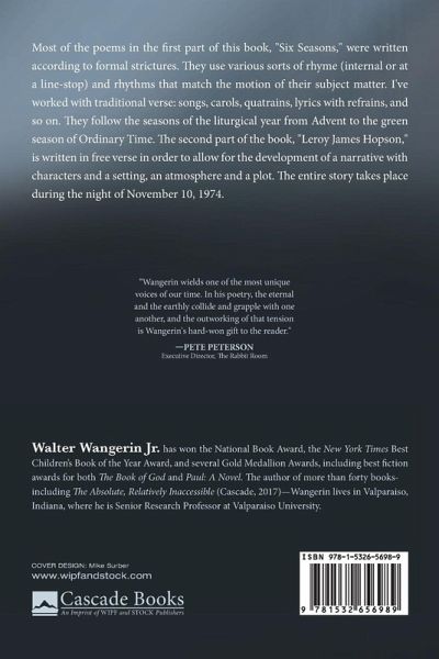 Most of the poems in the first part of this book, "Six Seasons," were written according to formal strictures. They use various sorts of rhyme (internal or at a line-stop) and rhythms that match the motion of their subject matter. I've worked with traditional verse: songs, carols, quatrains, lyrics with refrains, and so on. They follow the seasons of the liturgical year from Advent to the green season of Ordinary Time. The second part of the book, "Leroy James Hopson," is written in free verse in order to allow for the development of a narrative with characters and a setting, an atmosphere and a plot. The entire story takes place during the night of November 10, 1974.