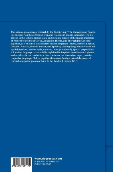 This volume presents new research by the Topoi group "The Conception of Spaces in Language" on the expression of spatial relations in ancient languages. The six articles in this volume discuss static and dynamic aspects of the spatial grammars of Ancient to Medieval Greek, Akkadian, Hittite, and Hieroglyphic Ancient Egyptian, as well as field data on eight modern languages (Arabic, Hebrew, English, German, Russian, French, Italian, and Spanish). Among the grams discussed are spatial particles, motion verbs, case and, most prominently, spatial prepositions. All ancient language data are fully explained in linguistic word-by-word glosses and are therefore accessible to scholars who are not themselves experts on the respective languages. Taken together, these contributions extend the scope of research on spatial grammar back to the third millennium BCE.