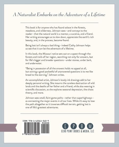 This book is for anyone who has found solace in the forests, meadows and wilderness. Johnson sees—and conveys to the reader—that the natural world is a mentor, curative and friend. Her writing encourages us to slow down, appreciate the earth’s rich beauty, and, in the process, become found. Being lost isn’t always a bad thing—indeed Cathy Johnson helps us see that it can be the adventure of a lifetime. In this book, the Missouri native sets out on a quest through the forests and trails of her region, searching not only for answers, but for life’s bigger and broader questions—under stones, under bark and underwater. "Being in possession of all the answers holds no appeal at all, but owning a good pocketful of unanswered questions is to me like bread to the starving," Johnson writes. An accomplished artist, Johnson’s lovely ink drawings, add to her deeply personal writing. She mourns the careless destruction of wild lands and the deaths of her father and a friend, while also weaving in scientific discussion as she explores seasonal depression, the chaos theory, and more. Johnson sees small, faint game paths—rather than superhighways—as connecting the major events in all our lives. While it’s easy to lose the path altogether as it traverses difficult terrain, getting lost is one of life’s greatest adventures. Readers interested in related titles from Cathy A. Johnson will also want to see: A Naturalist's Cabin (ISBN: 1635610656), The Nocturnal Naturalist (ISBN: 163561564X), Painting Nature's Details in Watercolor (ISBN: 1635615658).