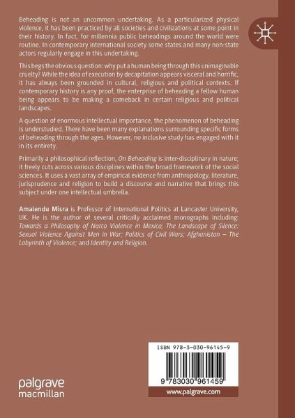 Primarily a philosophical reflection, On Beheading is inter-disciplinary in nature; it freely cuts across various disciplines within the broad framework of the social sciences. It uses a vast array of empirical evidence from anthropology, literature, jurisprudence and religion to build a discourse and narrative that brings this subject under one intellectual umbrella.