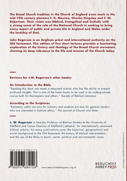 The Broad Church tradition in the Church of England owes much to the mid-19th century pioneers F. D. Maurice, Charles Kingsley and F. W. Robertson. Their vision was Biblical, Evangelical and Catholic with a strong sense of the role of the National Church in seeking to bring every aspect of public and private life in England and Wales under the lordship of God. John Rogerson is an Anglican priest and international authority on the Old Testament. This edition of five short lectures provides a fascinating exploration of the history and theology of the Broad Church movement, showing its deep relevance to the life and mission of the Church today.