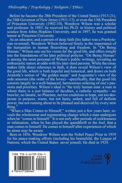Before he became the 28th President of the United States (1913-21), the 34th Governor of New Jersey (1911-13), or even the 13th President of Princeton University (1902-10), Woodrow Wilson (1856-1924) was a scholar and professor. In 1885, he received his Ph.D. in history and political science from Johns Hopkins University, and in 1897, he was granted tenure at Princeton University. As an educator, and a person of deep faith (his father was a Presbyterian reverend), Woodrow Wilson believed firmly in the importance of the humanities to human flourishing and freedom. In "On Being Human," Wilson sets out his vision for the good life, and offers insight into the foundations of his later political policies. "On Being Human" is among the most personal of Wilson's public writings, revealing an enthusiastic nature at odds with his later staid persona. While the essay makes little direct reference to faith, it does reveal Wilson's view of the good life, which is both hopeful and historical, and draws on both Aristotle's notion of "the golden mean" and Augustine's view of the ordo amorum (the order of the loves)-specifically, that the good life consists largely in a well-balanced, harmonious ordering of one's passions and priorities. Wilson's ideal is "the truly human man: a man in whom there is a just balance of faculties, a catholic sympathy?no brawler, no fanatic, no Pharisee, not too credulous in hope, not too desperate in purpose, warm, but not hasty, ardent, and full of definite power, but not running about to be pleased and deceived by every new thing." "When a Man Comes to Himself," written just a few years later, reveals the wholesome and regenerating change which a man undergoes when he "comes to himself." It is not only after periods of recklessness or infatuation, when he has played the spendthrift or the fool, that a man comes to himself. He comes to himself after experiences of which he alone may be aware.