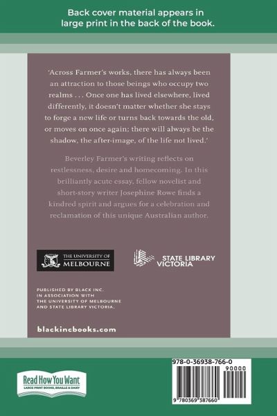'Across Farmer's works, there has always been an attraction to those beings who occupy two realms â¿¿ Once one has lived elsewhere, lived differently, it doesn't matter whether she stays to forge a new life or turns back towards the old, or moves on once again; there will always be the shadow, the after-image, of the life not lived.' Beverley Farmer's writing reflects on restlessness, desire and homecoming. In this brilliantly acute essay, fellow novelist and short-story writer Josephine Rowe finds a kindred spirit and argues for a celebration and reclamation of this unique Australian author. In the Writers on Writers series, leading authors reflect on an Australian writer who has inspired and fascinated them. Provocative and well-written, these books start a fresh conversation between past and present, shed new light on the craft of writing, and introduce some intriguing and talented authors and their work. Published by Black Inc. in association with the University of Melbourne and State Library Victoria.